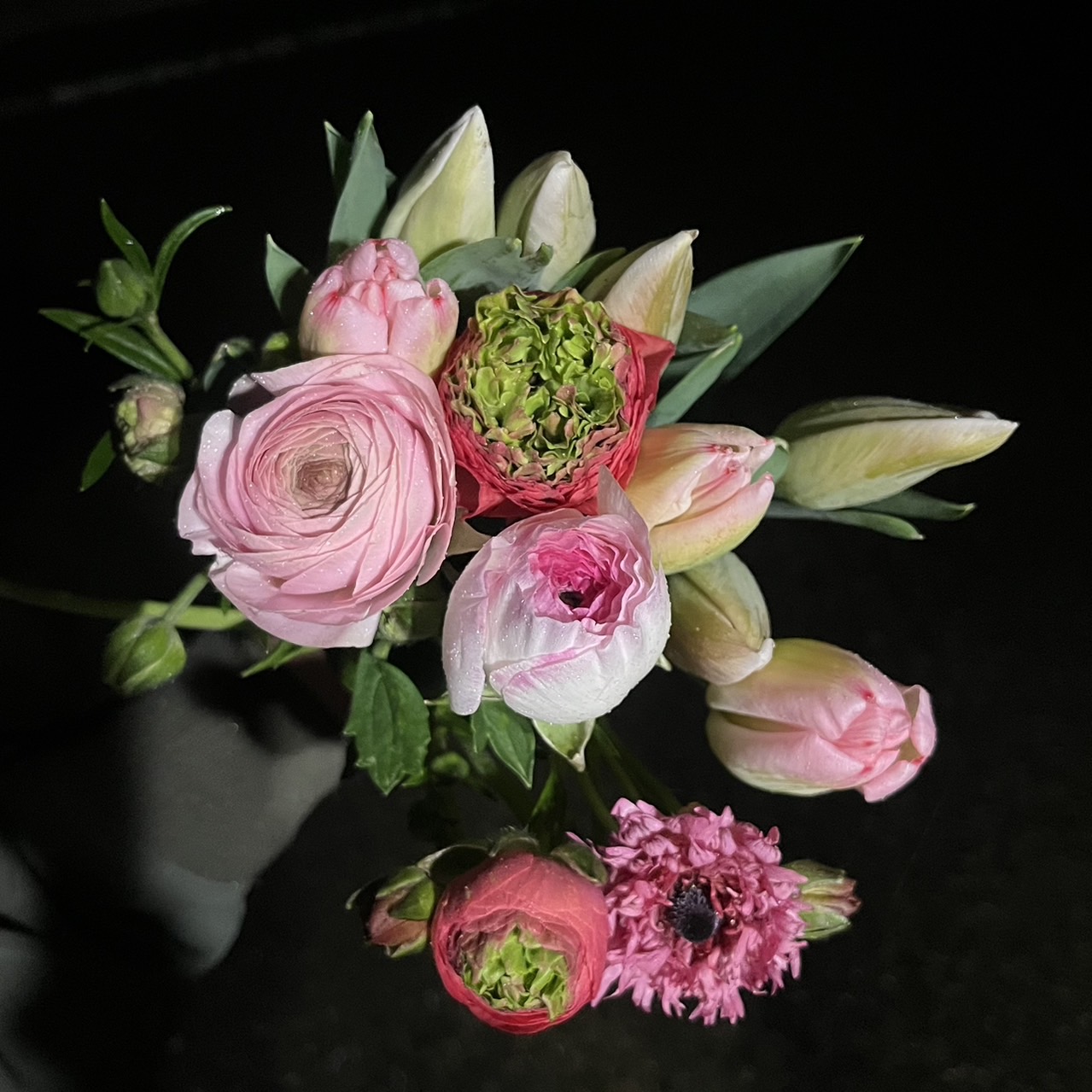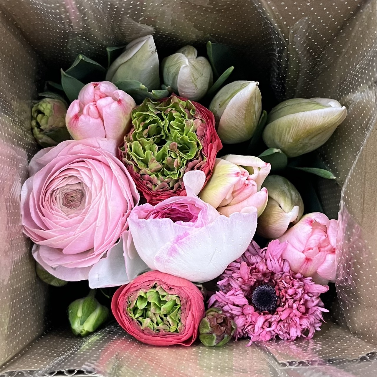 ピンクのチューリップ8本、ピンク・ミドリ・紫のラナンキュラス5本とラックスが1本入ったお得な花束です。